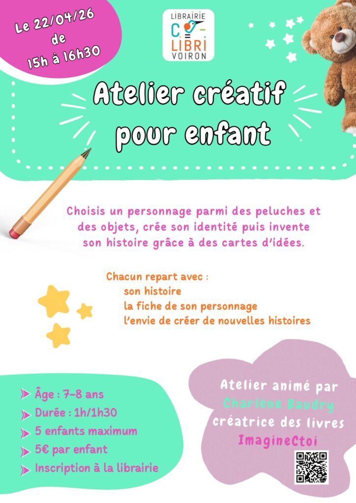 L’atelier créatif du mercredi 22 avril est fait pour eux ! De 15h à 16h30, les enfants pourront profiter d’un atelier créatif autour de l’imaginaire et de l’écriture, animé par Charlène Baudry, et au prix de 5€.